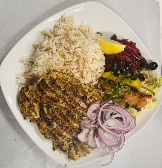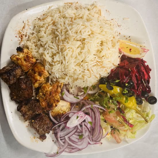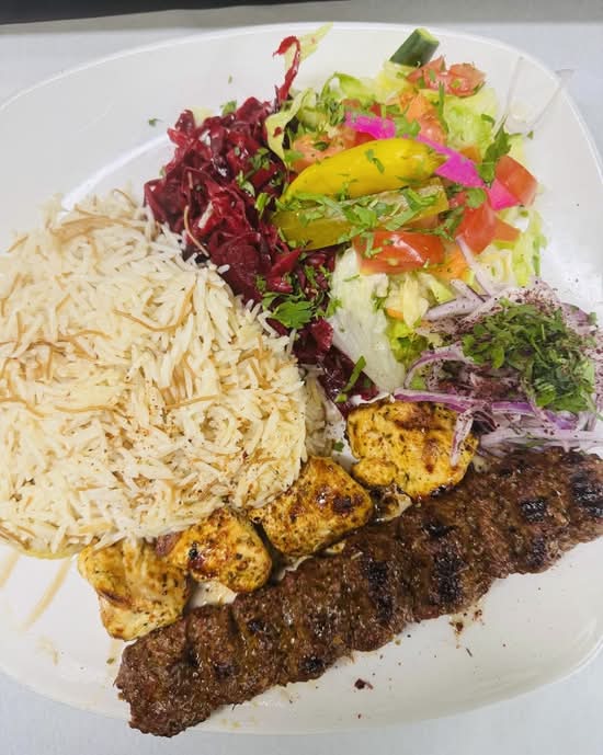 A: The Mixed Grill typically includes Kofta kebab, lamb shish, and chicken shish, accompanied by salad and a choice of rice or chips.