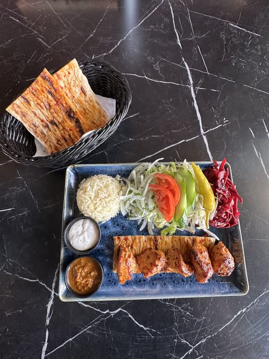 A: All charcoal grill kebabs are served with house salad, rice, Turkish bread, garlic sauce, and chilli sauce.
