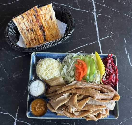 A: Doner Kebabs are served with a side of house salad, Turkish bread, and your choice of chilli or garlic sauce.