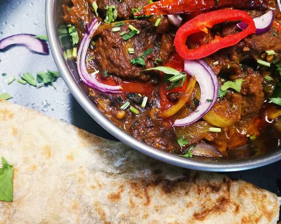 A: This dish involves meat cooked until tender, panfried in spices and sizzled in Baba’s meat sauce, served with Sylheti-style paratha.