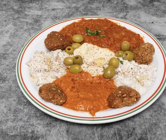 A: This section includes English Breakfast (Meat Option), Arabic Breakfast, Vegetarian Breakfast, and Shakshouka.