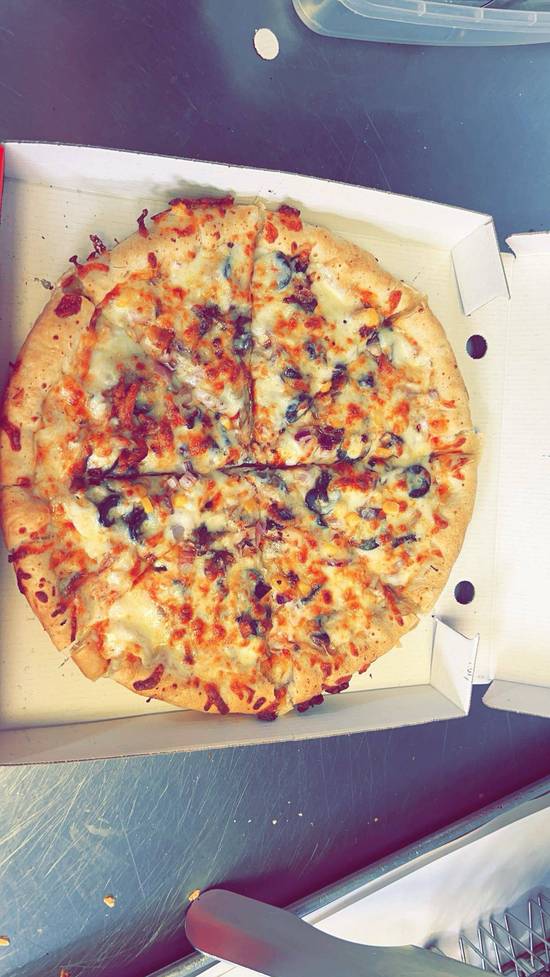 A: The menu mainly features fried chicken, various burgers, kebabs, wraps, and several pizza options.