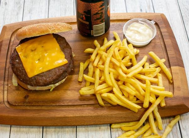 A: Yes, the menu features burgers, side orders like fries, and desserts.