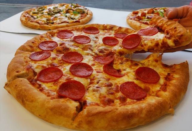 A: Pizzas are available in 7″, 9″, 12″, and 15″ sizes.