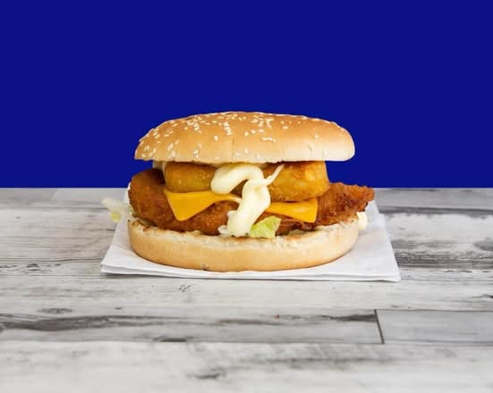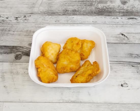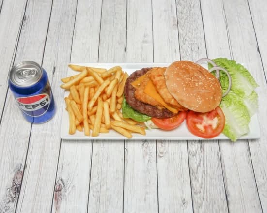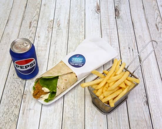 A: The 7″ box contains 4 chicken strips, 4 chicken nuggets, 4 chicken wings, garlic mayo, BBQ dip, and a can of Pepsi.