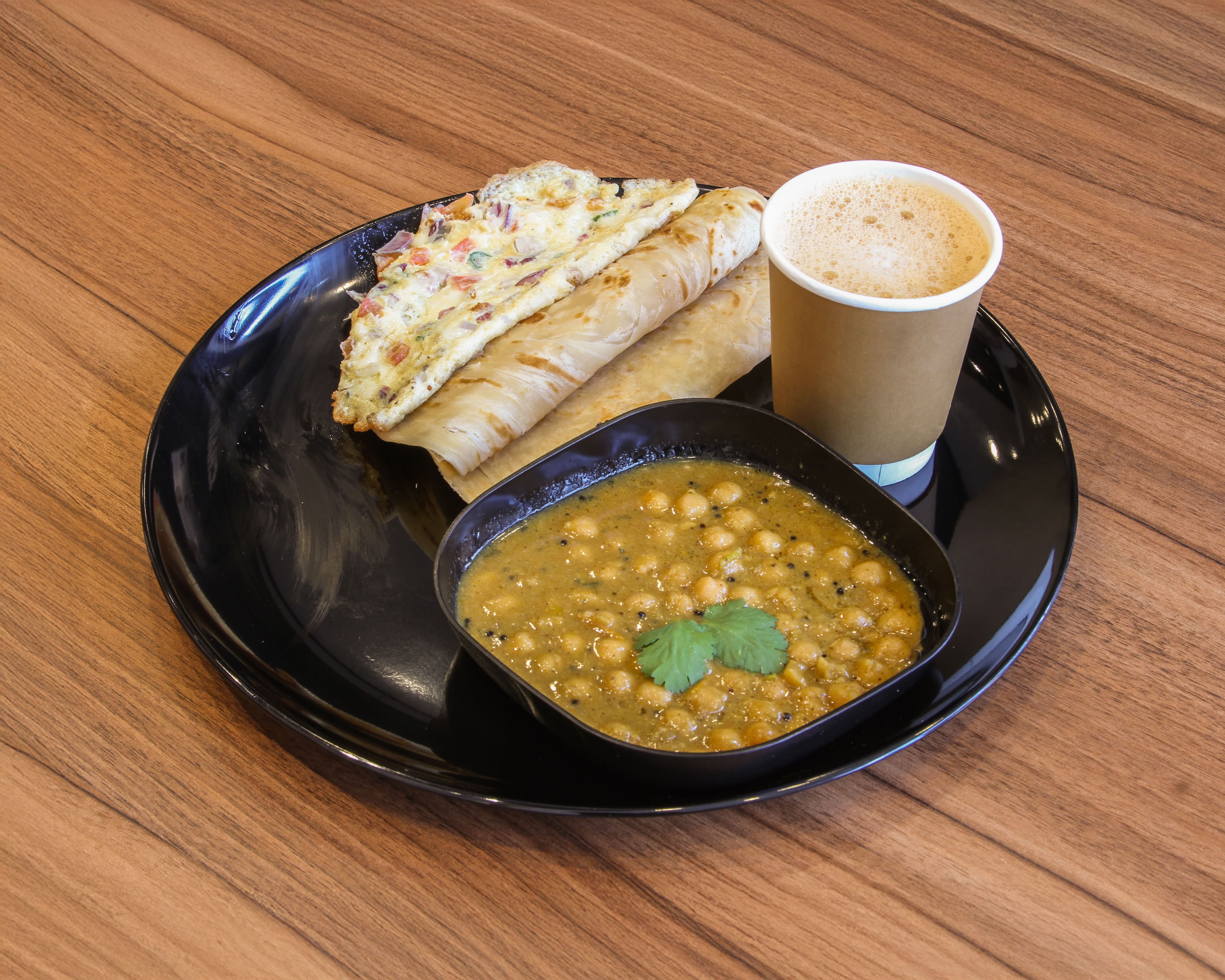 A: The Cuppa Desi Breakfast includes two paratas, one masala omelette, one channa bowl, and one hot drink.
