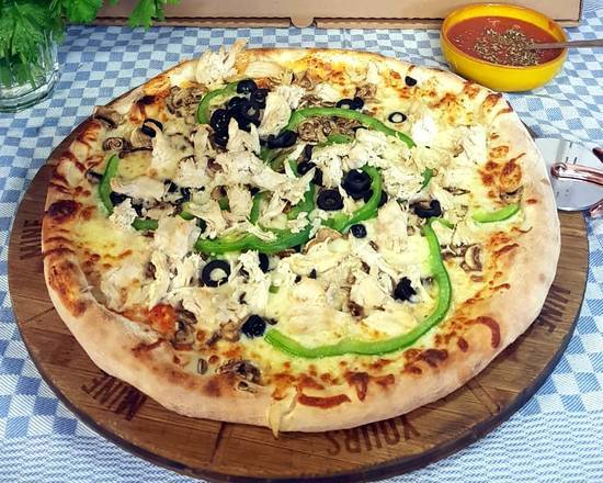 A: Yes, the ‘Natura Pizza’ is listed with veggie mozzarella, mushrooms, tomatoes, pepper, olives, and corn.