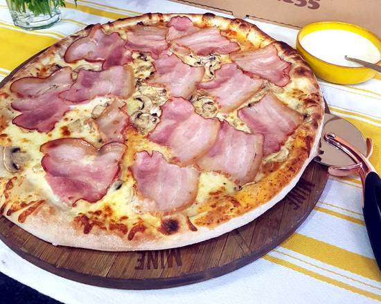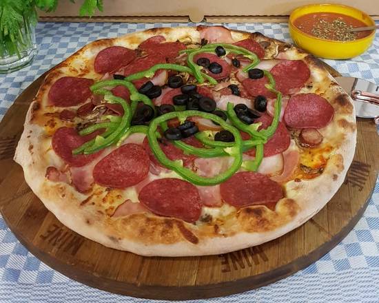 A: The ‘Cool Pizza’ is served with tomato, mozzarella, ham, mushrooms, salami, bacon, sausage, peppers, olives, and oregano.