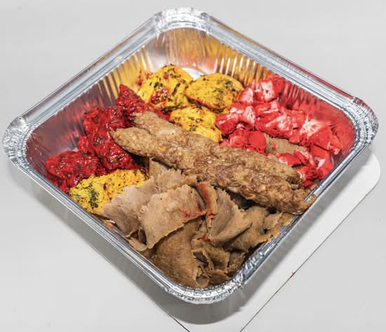 A: The Munch Box contains chicken tikka, donner meat, seekh kebab, chicken donner, lamb tikka, chips, and two dips.
