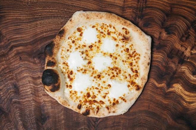 A: The Margherita pizza contains tomato sugo, mozzarella cheese, and basil, finished with extra virgin olive oil.