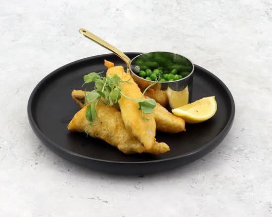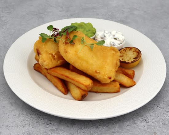 A: The menu features a Freshly Battered Line-Caught Haddock & Chips main course.