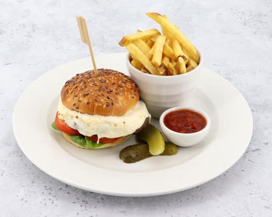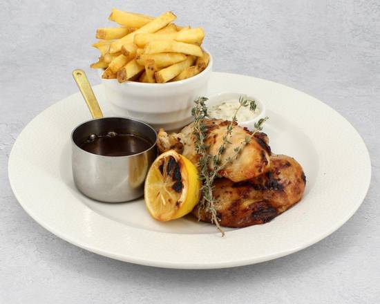 A: The main courses include rotisserie chicken, fish and chips, pasta dishes, and halloumi options.