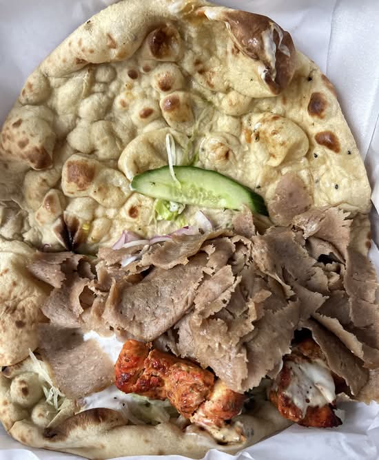 A: It includes mixed chicken, lamb, donner, and kofta meats, served with plain and special naan, two tubs of sauces, and two cans of drink.
