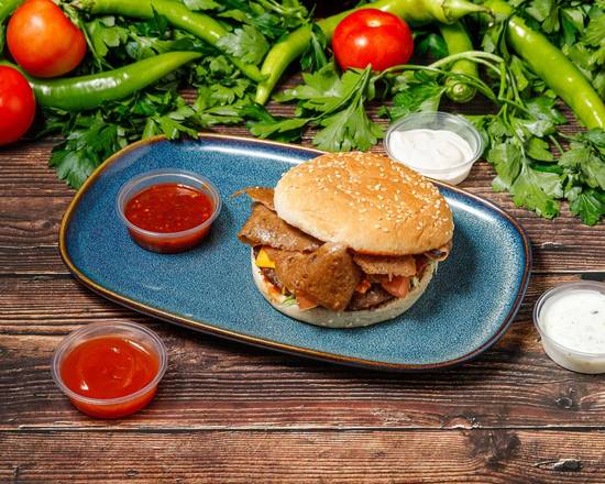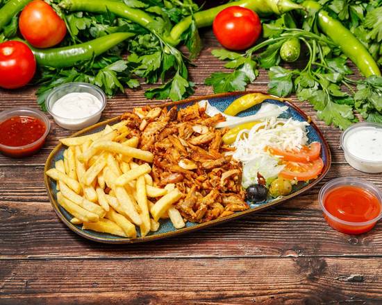 A: The Donner Kebab is served with naan or pitta bread, salad, and sauce on the side.