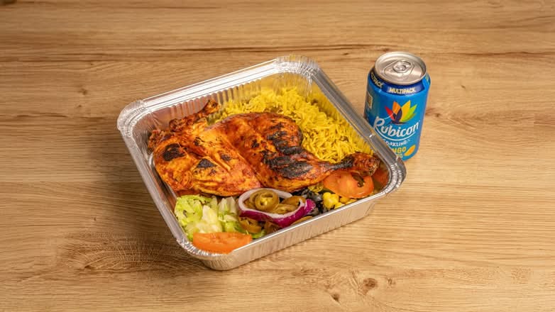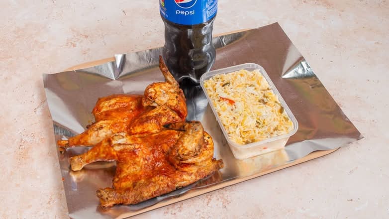 A: The Half Chicken Meal typically contains a half chicken, regular fries, a drink, and a choice of one side like coleslaw or beans.