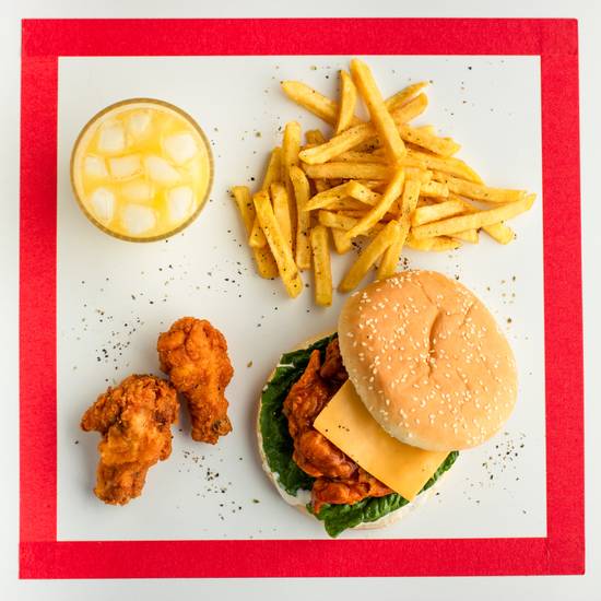A: Yes, kids’ meals include options for a Chicken Burger, Cheese Burger, or 3 Chicken Nuggets, all served with fries and a drink.