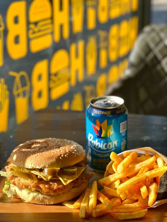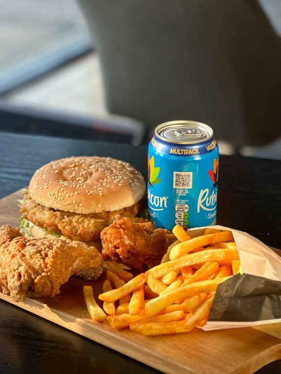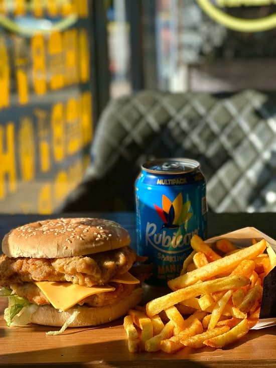 A: The menu prominently features burgers, pizzas, various combo boxes, fried chicken items, and wraps.