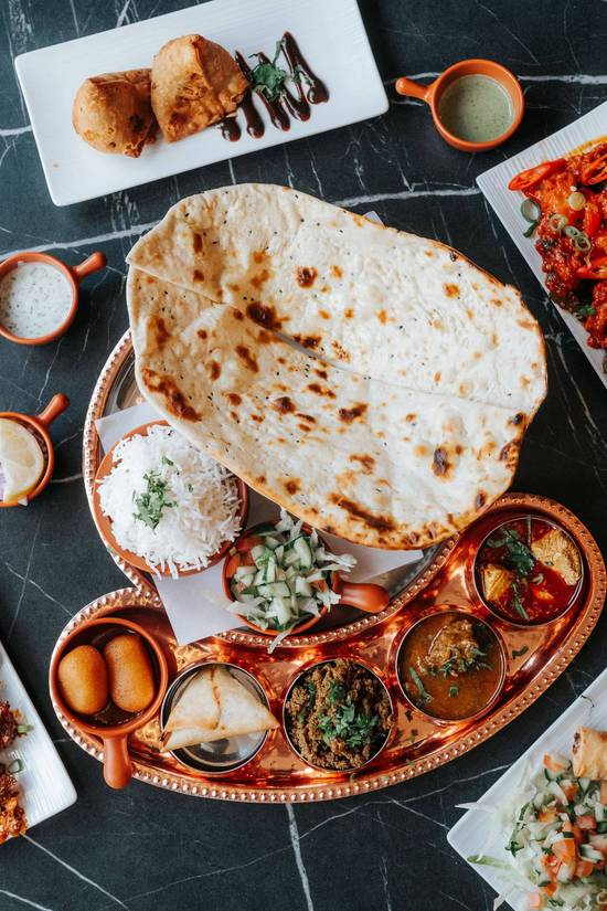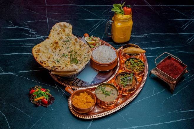 A: The Veg Thali includes rice, naan, a starter, three curries, and salad.