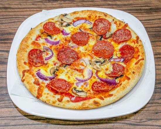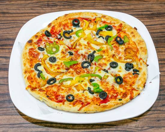 Toppings include: green pepper, mushroom, red onion, olives and tomatoes.