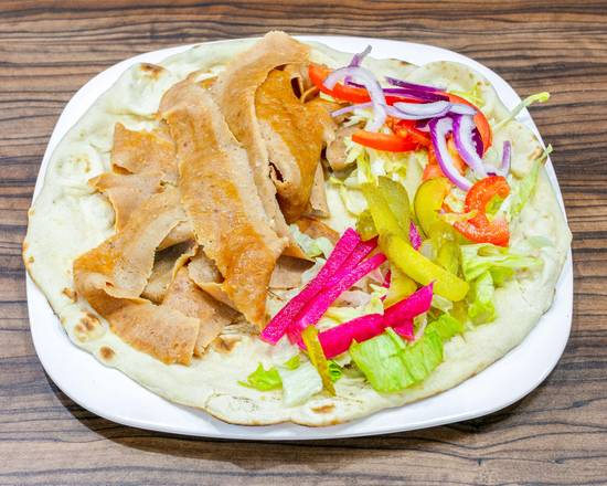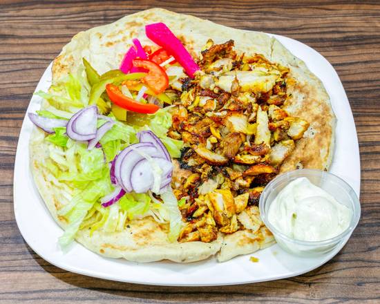 Includes: one skewer of chicken tikka, one skewer of chicken BBQ, one skewer of lamb shish, chicken shawarma and lamb doner served in two medium fresh tandoori naan bread. Comes with salad and two sauces of your choosing.
