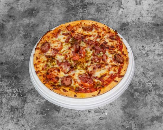 A: The Mighty Meaty Pizza contains Ham, minced meat, pepperoni, salami, and succulent sausage.