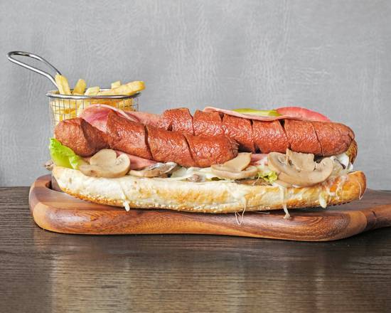 A: The Hotdog Shirazi features a beef hotdog sausage with a special sauce blend topped with Persian salami in a fresh baguette.