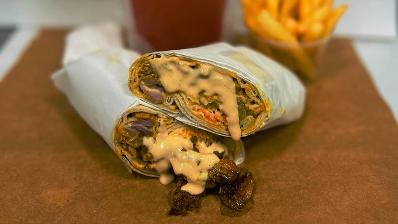 A: The standard Chicken Shawarma is wrapped in homemade tortilla with garlic sauce, carrots, and cabbage.