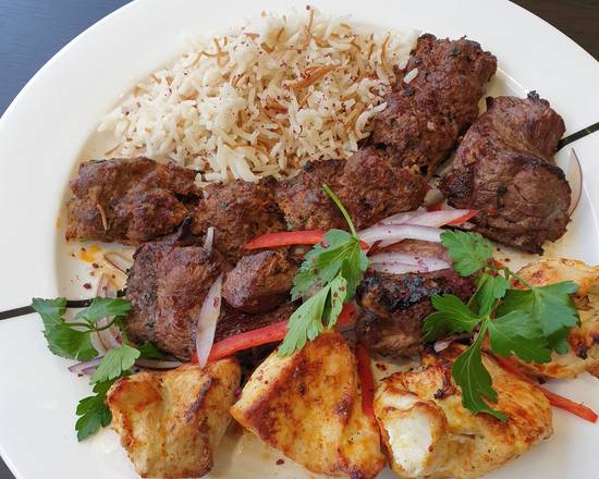 A: This platter includes lamb shish, chicken shish, lamb kofta, lamb ribs, lamb chops, full chicken, shawarma, salad, rice, and chips.