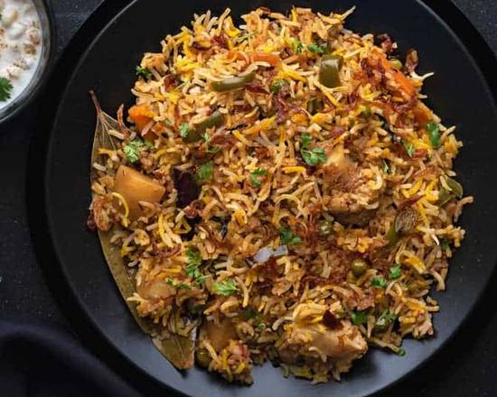 | Vegetable Biryani Served with curry sauce. |