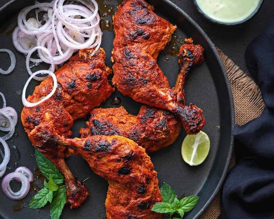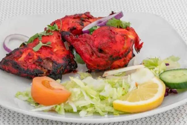| Chicken Tikka Fire Flame Chicken Tikka prepared with fresh green chillies, tomatoes garnished with coriander, and a whole red chilli. |