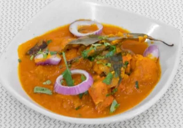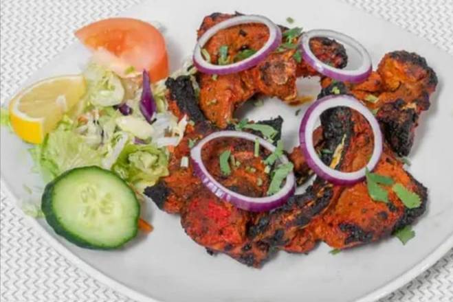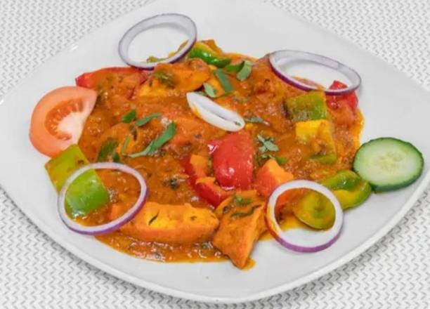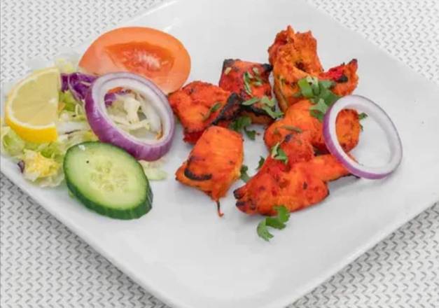 | Chicken Tikka Shashlik Juicy Chicken Tikka with Grilled Juicy Tomato, Pepper and Onion, served with curry sauce. |