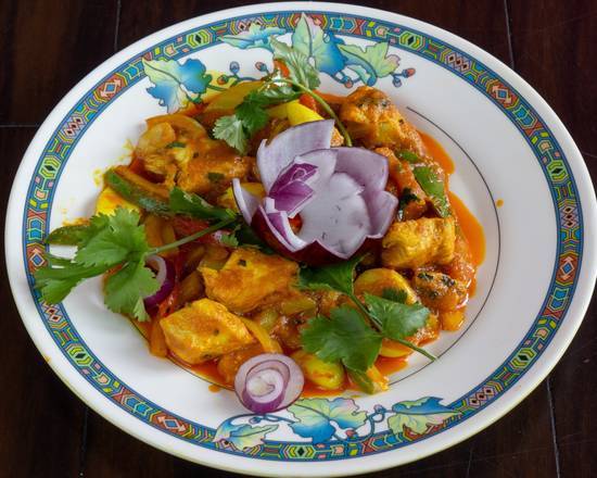 | Chicken Tikka Joypuri Cooked with onion, peppers herbs and spices in a medium strength sauce, tangy, and slightly hot. |