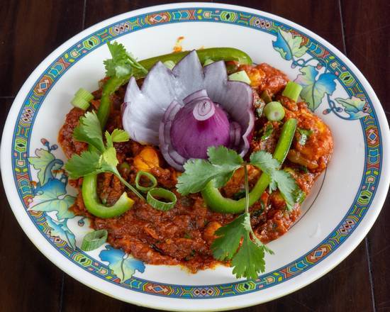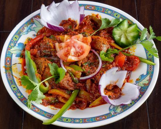| Lamb Tikka Sylheti Cooked in thick spicy sauce with spring onion, coriander and garlic with fresh tomato, green pepper, and green chilli. |