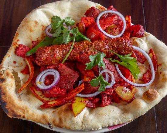| Lamb Tikka Shashlick Kharai Traditionally cooked with green and red peppers, onion, and grilled in the clay oven with a succulent sauce. |