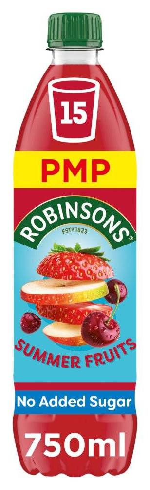 | Robinsons Summer Fruits No Added Sugar Squash PMP 750m Real Fruit in Every Drop Only 5 Calories Per Glass No Added Sugar Contains Naturally Occurring Sugars Vegetarian Society Approved – Vegan Suitable for vegetarians and vegans |