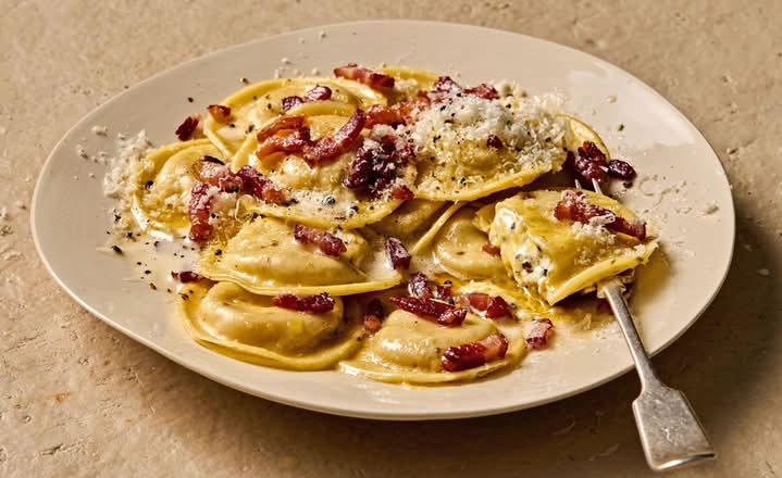 A: The Carbonara of dreams is prepared with guanciale, pancetta, egg, and Pecorino Romano DOP cheese.