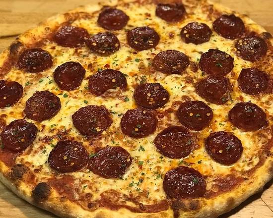 A: The pizza dough is freshly made from scratch on the premises daily and is hand-stretched to order before being cooked directly on the oven stone.