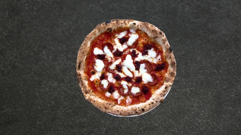 A: The Meat Feast includes Parma ham, spicy Calabrian ’nduja, and Neapolitan salami on a tomato and mozzarella base.