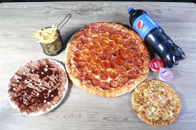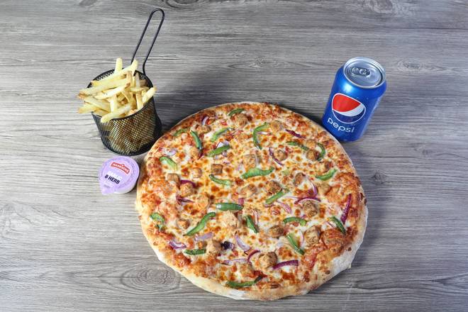 A: Yes, there are meal deals for Personal, Small, Medium, and Family sizes, offering pizza, sides, dips, and drinks.