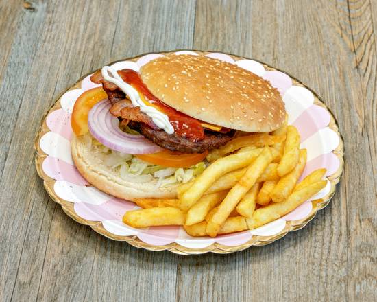 A: Several burgers, like the Sizzler Burger and the Posh Nosh Special Cheese Burger, include bacon.