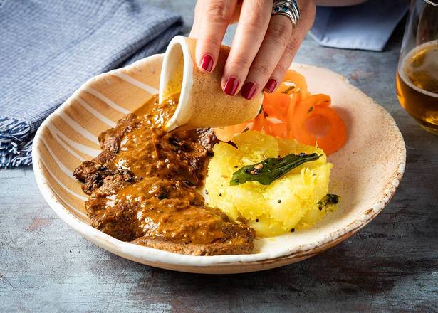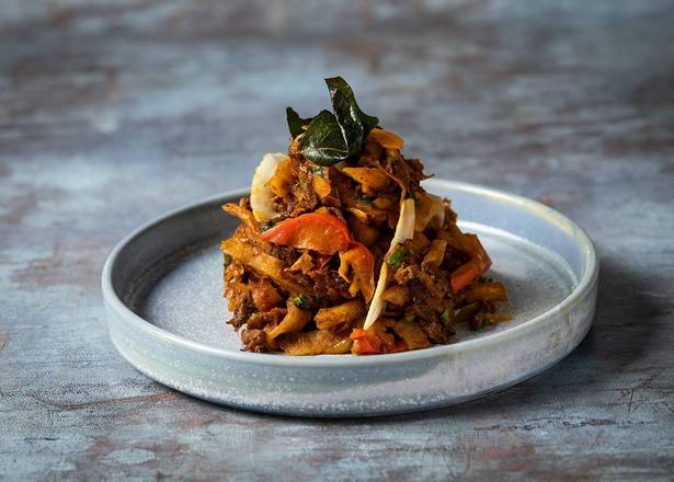 A: Yes, the menu includes items featuring beef, such as Street Cart Beef Pepper Fry and Beef Sukha Kothu Porotha.