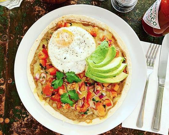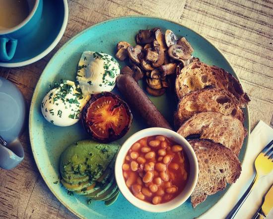 A: The Rubio Breakfast consists of two poached eggs, bacon, sausage, grilled tomato, Portobello mushrooms, beans, and sourdough toast.