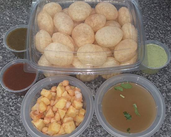 A: It includes soft dough puri, chickpea curry, semolina halva, achar, and a small tub.
