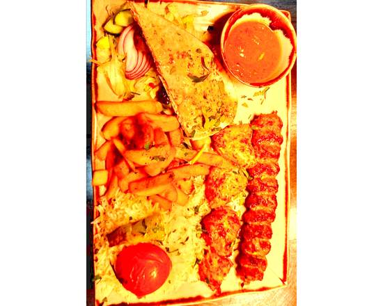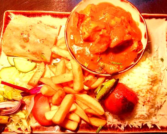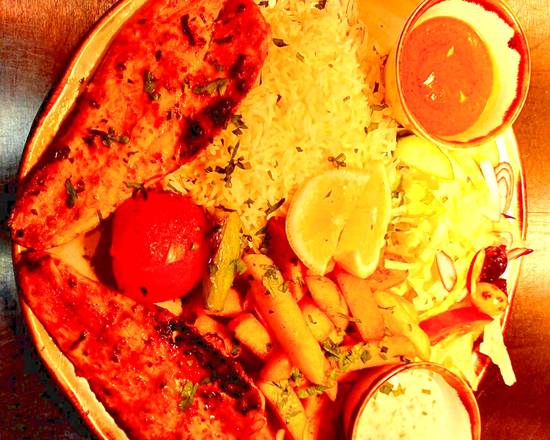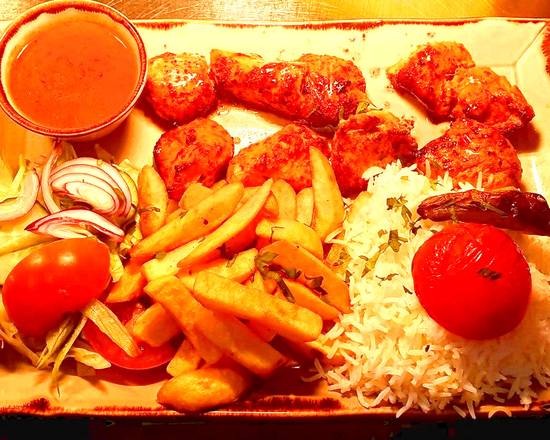 A: Most charcoal main courses and kebabs are served with chips, rice, and salad.
