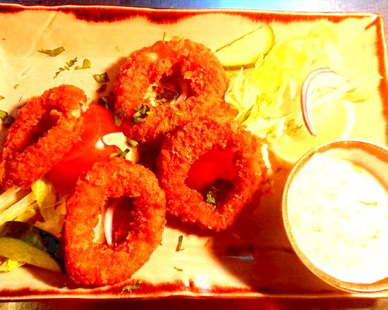 A: The menu features Kalamar (fried calamari) and BBQ Chargrilled Fresh Fish, as well as a Seafood Calzone.