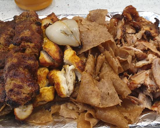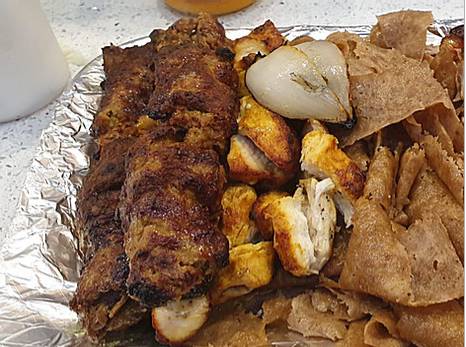 A: The Mix Family Platter typically includes Lamb Tikka, Chicken Tikka, Chicken Shawarma, Hot Wings, Kobida Kebab, 1/2 Chicken, and two naan breads.