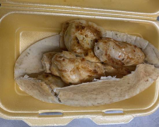 A: All kebabs are served in pitta bread and come with salad items including onions, lettuce, red cabbage, tomato, and peppers.