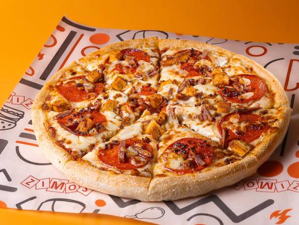 A: The Meat Carnival Pizza topping selection includes chicken, turkey ham, spicy beef, and pepperoni.