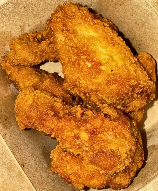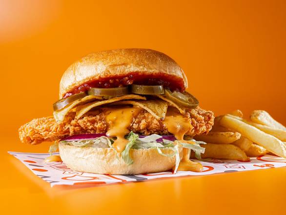 A: This item is topped with diced chicken strips, house sauce dressing, jalapenos, hot cheese sauce, and spring onions.